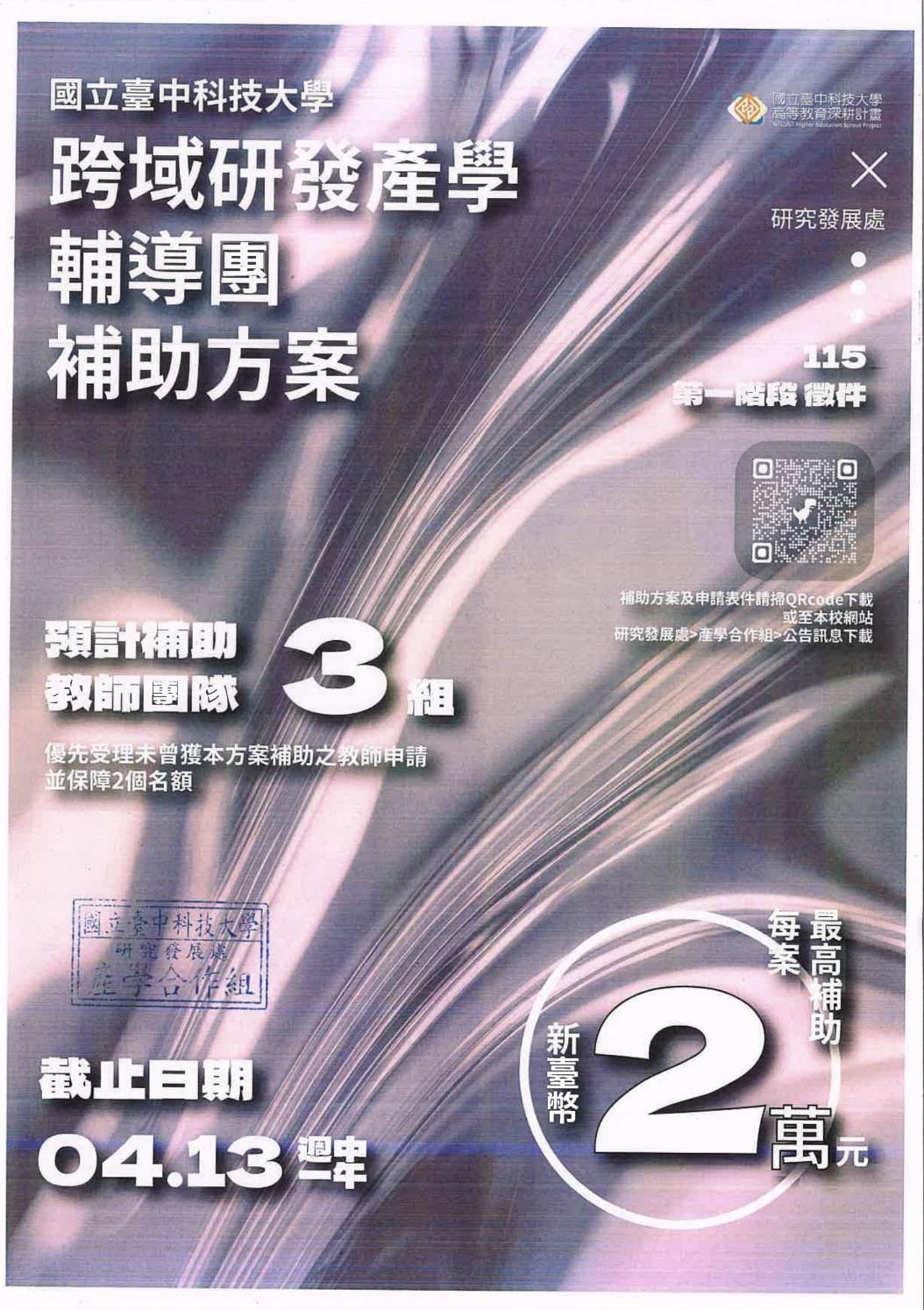 國立臺中科技大學115年「跨域研發產學輔導團補助方案」徵件第一階段即日起開始受理